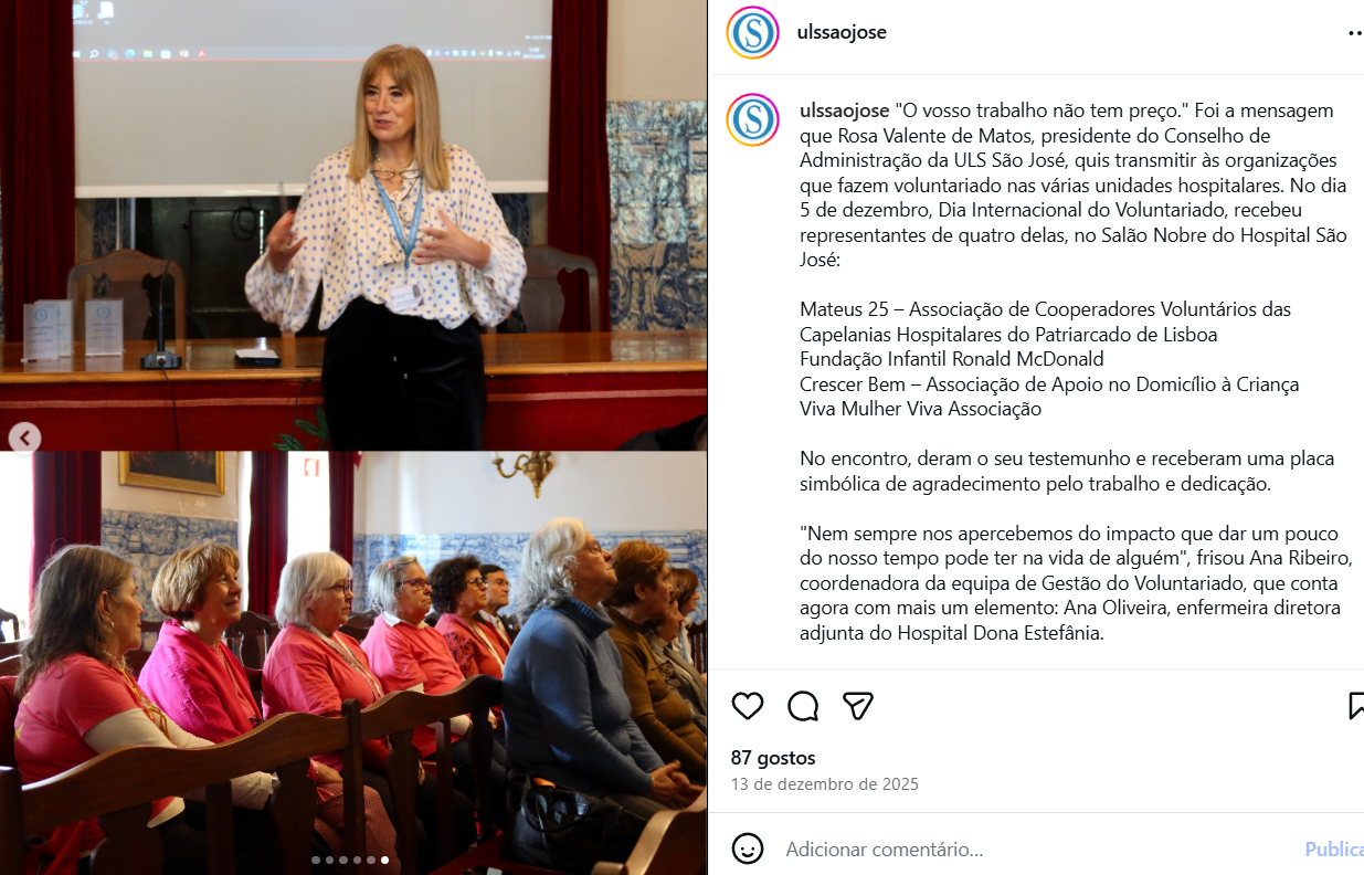 Para assinalar o dia, a Equipa de Gestão do Voluntariado e a Presidente do Conselho de Administração da ULS São José receberam representantes das organizações que fazem voluntariado nesta instituição, no Salão Nobre do Hospital de São José. Cada organização teve oportunidade de dar o seu testemunho sobre o trabalho desenvolvido e recebeu uma placa simbólica de agradecimento pela dedicação e empenho.